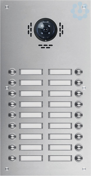 TVG-18/2 Aussenstat. für Kamera-Türlautsp.18/2 Rund-Taster UP Edelst. matt ESTA. Unterputz Video-Türstation für Sprechanlage/Intercom nach DIN EN 50486. Bestehend aus einer 2 mm dicken Frontplatte aus Edelstahl matt gebürstet mit Lochsprechöffnungen, runder Klingeltaster, Spezialschrauben, Namensschild (von vorn wechselbar) mit LED-Beleuchtung, Video-Vorbereitung und UP-Kasten 55 mm Tiefe. Hinweis: Passende Elektronik und Lautsprecher erforderlich.