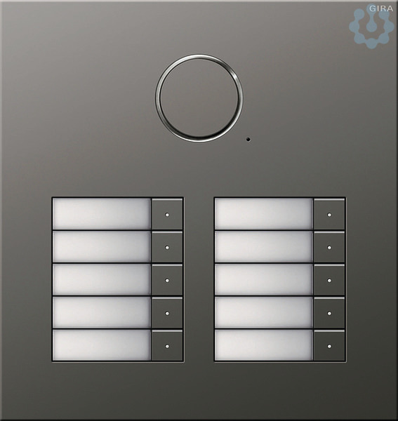 Türstation Edelstahl10fachEdelstahlMerkmale: 3 mm starke, geschliffene Edelstahlfrontplatte aus hochwertigem Edelstahl V2A. Dadurch ist diese besonders widerstandsfähig gegen Umwelteinflüsse und Vandalismus. Schraubenloses Montagesystem. Die Entriegelung erfolgt mit einem speziellen Öffnungswerkzeug, welches dem Produkt beiliegt. Unterputz-Kasten mit Mauerankern und Öffnungen für die Leitungseinführung. Spezielles Konstruktionsprinzip des Lautsprechers und des Mikrofons zur Vermeidung von Angriffen durch Vandalismus und Eindringen von Feuchtigkeit. Aufgrund des Aufbaus ist es nicht möglich, mit einem spitzen Gegenstand den Lautsprecher oder das Mikrofon zu durchstoßen. Freisprechfunktion (sprachgesteuertes Gegensprechen mit Echo- und Hintergrund-Geräuschunterdrückung) Sprechlautstärke einstellbar. Vandalismusgeschützte Edelstahlruftasten. Diese sind bündig in die Frontplatte eingelassen und besitzen ein präzises Schaltverhalten während der Ruftastenbetätigung. Quittungston bei Ruftastenbetätigung (bei Bedarf abschaltbar). Nachtdesign der Edelstahlruftasten. Die Ausleuchtung erfolgt mittels weißer LED-Beleuchtung. Das Beschriftungsfeld bzw. die Namensschilder werden über die wartungsfreie und stromsparende LED-Technologie gleichmäßig weiß ausgeleuchtet. Die Abdeckscheiben für die Namensschilder sind bündig in die Frontplatte eingelassen und bestehen aus bruchsicherem, kratzfestem, 5 mm starken securisiertem Glas. Sie sind damit besonderes widerstandfähig gegen Angriffe durch Vandalismus in Form von Schlag, Feuer, Kratzer etc. Die Abdeckscheiben sind leicht zu reinigen. Die Namensschilder sind ohne Demontage der Türstation Edelstahl von vorn entnehmbar. Die Entriegelung der Namensschilder ist verdeckt angeordnet. Die Namensschilder sind gegen Spritzwasser geschützt. Montagehilfe während der Montage mittels Fangband und Ablagefläche im Unterputz-Kasten. Einmann-Inbetriebnahme durch einfache Inbetriebnahme-Prozedur. Umlaufende Moosgummidichtung zur Wandabdichtung auf der Unterseite der Frontplatte. Große Überdeckung zwischen Unterputz-Kasten und Mauerwerk. Bei größeren Anlagenkonstellationen erfolgt die Befestigung der Frontplatte mittels Schrauben. Professionelle Beschriftung über den Gira Beschriftungsservice www.beschriftung.gira.de oder die Gira Beschriftungssoftware.Hinweise : Die Türstation Edelstahl wird anschlussfertig inkl. Einbaulautsprecher. Dadurch ist keine zeitaufwändige Verkabelung der Ruftasten erforderlich. Zum Betrieb der Türstation Edelstahl ist lediglich der Anschluss des Gira 2-Draht-Busses nötig.