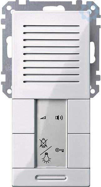 Für TwinBus Türsprechanlagen. Freisprechverkehr zur Türstation und Öffnen der Haupttür und/oder Etagentür. Türöffnertaste. Taste für Treppenhauslicht oder Rufabschaltung. Rufabschaltung: Türruf wird optisch signalisiert. Gespräch annehmen/beenden. Sprach- und Ruftonlautstärkeregelung in 4 Stufen. 5 Ruftöne. Ruftonunterscheidung Tür/Etage. Rufanschalterelais. Mithörsperre. Bis zu 10 Klingeltasten von Türstationen einlernbar. Großer Anschlussraum. Geringe Aufbauhöhe (16 mm). Die Montage erfolgt auf einer handelsüblichen flachen Unterputz-Gerätedose nach DIN 49073, Teil 1. Versorgungsspannung: TwinBus aus Netzgerät 17573. Stromaufnahme in Ruhe: max. 3 mA. Bedienelemente: Türöffnertaste, Taste für Treppenhauslicht/Rufabschaltung, Lautstärkeregelung, Gespräch annehmen/beenden. Abmessungen: 126x55 mm (HxB). Zu komplettieren mit: 2fach Rahmen ohne Mittelsteg. Lieferumfang: Anschlussklemme TwinBus. Tragring und Schrauben. Material: Thermoplast brillant. Farbe: polarweiß glänzend.