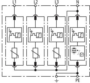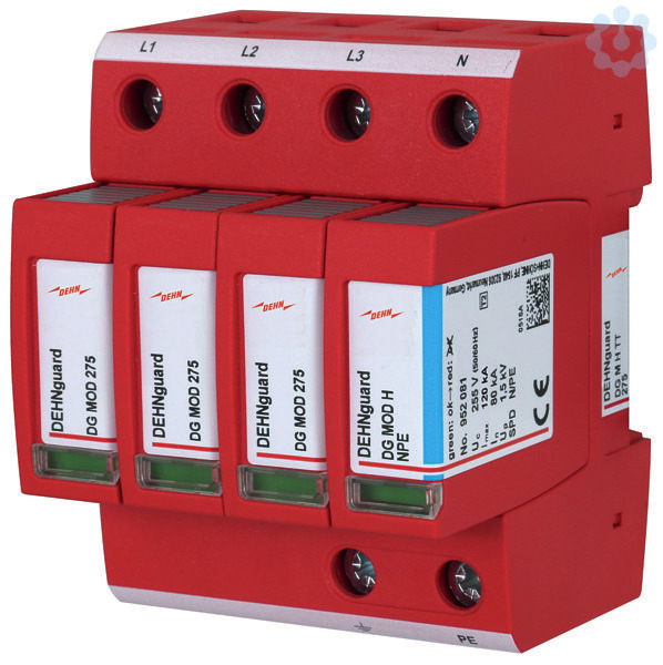 Mehrpoliger Überspannungsableiter DEHNguard M, Typ 2 nach EN 61643-11 mit hohem Ableitvermögen, bestehend aus Basisteil und gesteckten Schutzmodulen. Hohe Gerätesicherheit durch Ableiterüberwachung mit Thermo-Dynamik-Control. Zum Schutz von Niederspannungs-Verbraucheranlagen vor Überspannungen. Zum Einsatz im Blitz-Schutzzonen-Konzept an den Schnittstellen 0B – 1 und höher.