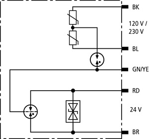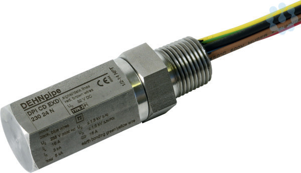 Überspannungsableiter in kombinierter Ausführung für Energie und Datenseite. Druckfeste Kapselung zum Einsatz in explosionsgefährdeten Bereichen in Zone 1 und 2, zum Schutz einer 120 / 230 V-Netzversorgungs- und einer 24 V-Datenschnittstelle von Feldgeräten. Zusätzliche Sicherheit durch verwechslungssichere Y-Schaltung für die 120 / 230 V-Netzversorgung. Durch Ausführung II 2 G Ex d IIC T5/T6 universell einsetzbar in Ex-Zone 1 und 2.