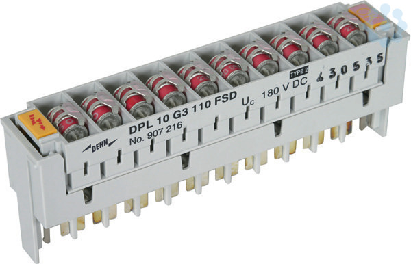 Steckmagazin für 10 DA mit dreipoligen Gasentladungsableitern für nahezu alle Anwendungen. Die Ableiter verfügen über eine fail-safe-Funktion und zusätzlich eine optische Anzeige nach Auslösen des fail-safe. So kann sofort erkannt werden, ob ein Ableiter ausgetauscht werden muss.