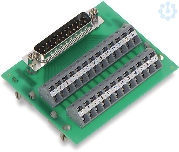 Übergabemodul; Sub-Min-D; Stiftleiste; 25-polig; Gegenstecker mit Schneidklemmanschluss; Steckrichtung vertikal; Leiterplattenklemmen, 2-reihig; mit Montagefüßen; 2,50 mm²