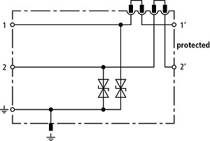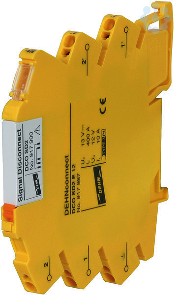 Überspannungsableiter-Reihenklemme DEHNconnet SD2. Fein begrenzender Überspannungsschutz mit leistungsfähigen Dioden gegen Erde für 2 Einzeladern mit gemeinsamem Bezugspotential sowie unsymmetrischer Schnittstellen. Signaltrennung über Steckmodul möglich.