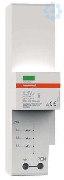 Überspannungsableiter Typ 1+2 12KA Uc 255V, nach EN 61643-11 für das 40mm sammelschienensystem im Zählerplatz, mit Funkenstrecken-Technologie, energetisch koordinierte Schutzwirkung zum Endgerät (gleich kleiner 5m) Typ 1+2+3 für TNC-Systeme (Schaltungsvariante 3+0). Funktionskontrolle durch Taster mit Leuchtmelder, ausschaltselektriv zum 35 A gL/gG Sicherungen bis zu 25kAeff Kurzschlussstrom, Blitzstrom (10/350): 37,5 kA, Nennableitstroßstrom (8/20): 20/60kA, Schutzpegel: gleich kleiner 1,5kV, Schutzpegel, Schutzart: IP20, zum Einsatz im Hauptstromversorgungssystem bei Wohngebäuden mit äußerem Blitzschutz (Blitzzschutzklasse III+IV)