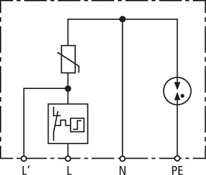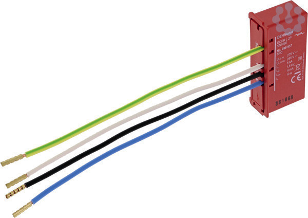 Zweipoliger Überspannungsableiter DEHNcord L, Typ 2 nach EN 61643-11, in kompakter Bauform zum Einsatz in Kabelübergangskästen von LED-Mastleuchten mit Abschaltung des Laststromkreises im Fehlerfall. Zum Einsatz im Blitz-Schutzzonen-Konzept an den Schnittstellen 0B – 1 und höher.