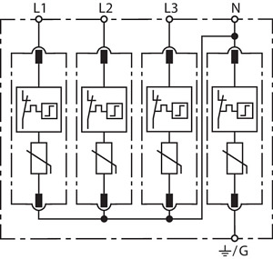 Mehrpoliger Überspannungsableiter DEHNguard MU, Open-Type 1 SPD nach ANSI/UL 1449 bestehend aus Basisteil und gesteckten Schutzmodulen. Hohe Gerätesicherheit durch Ableiterüberwachung mit Thermo-Dynamik-Control. Ermöglicht Endgeräteschutz. Zum Schutz von 3 Phase Wye Systeme.