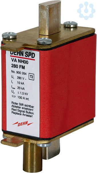 Einpoliger Überspannungsableiter VA NH, Typ 2 nach EN 61643-11 mit Varistor-Funkenstrecken-Reihenschaltung in NH-Bauform mit integrierter Ableitervorsicherung. Zum Schutz von Niederspannungs-Verbraucheranlagen vor Überspannungen. Zum Einsatz im Blitz-Schutzzonen-Konzept an den Schnittstellen 0B – 1 und höher.
