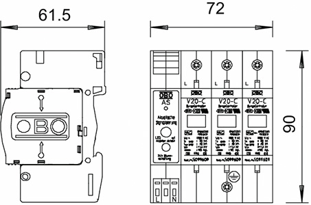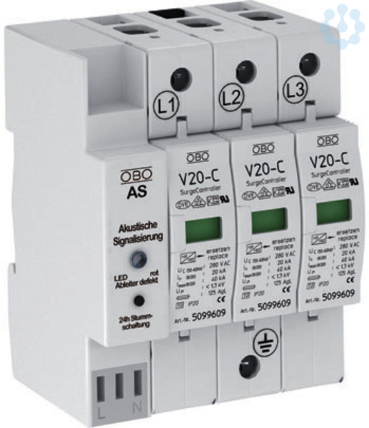 Überspannungsableiter Typ 2 (Klasse C) nach VDE 0675 Teil 6-11 (DIN EN 61643-11). Kompletteinheit, bestehend aus Ober- und Unterteil, vormontiert und anschlussfertig, Steckbares Oberteil, Oberteil ohne Werkzeug vom Unterteil zu trennen, inkl. thermischer und dynamischer Abtrennvorrichtung, mit optischer und aktustischer Defektanzeige, hohe Stromleitfähigkeit bei langer Lebensdauer
