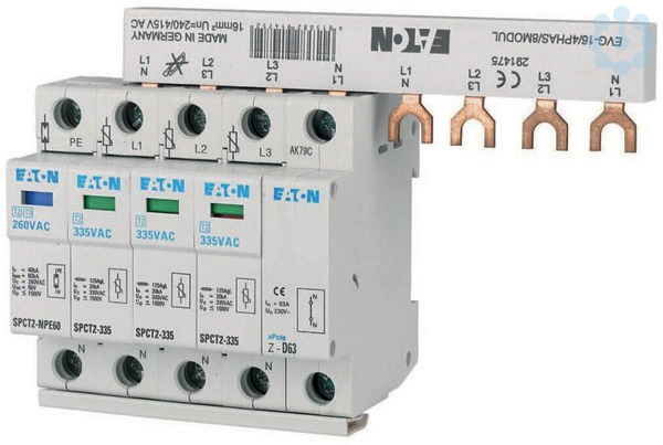 Zum Schutz von Verbraucheranlagen gegen transiente Überspannungen hervorgerufen durch indirekte Blitzschläge und Schalthandlungen, Prüfklasse II nach IEC 61643-1+A1, SPD-type T2 nach EN 61643-11, Hilfsschalter SPC-S-HK für Fernmeldung anbaubar, Verschienbar mit allen Xtra Combinations Schaltgeräten