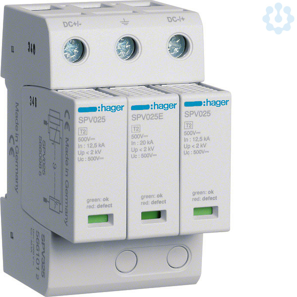 Überspannungsableiter 3 polig 25kA Typ 2 Klasse 2/C Photovoltaik. Photovoltaik-Überspannungsableiter bis 1000 V DC mit 3-stufiger DC-Schalteinrichtung Anforderungsklasse Typ 2 nach DIN EN61643-11, einsetzbar gemäß IEC 60364-7-712. Errichten von Photovoltaik-Versorgungssystemen. Kombinierte Abtrenn- und Kurzschließvorrichtung, sichere elektrische Trennung im Schutzmodul verhindert Brandschäden infolge DC-Schaltlichtbögen Hochleistungsvaristoren, vermeidet Schädigung des Überspannungsschutzes bei Isolationsfehlern im Generatorkreis. Sicherer lichtbogenfreier Schutzmodulwechsel durch integrierte Gleichstrom-Sicherung, Basisteil mit gesteckten Schutzmodulen, Schutzmodul-Kodierung.