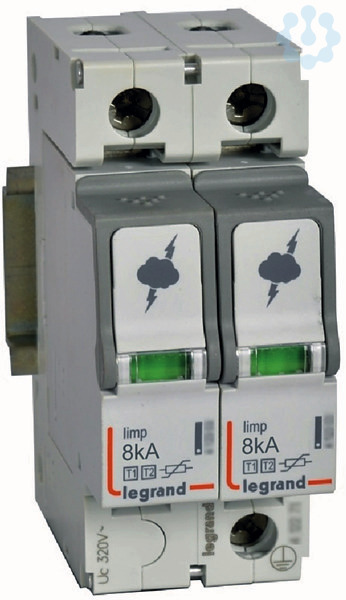 Legrand Kombiableiter Typ 1+2/Class I+II nach IEC/EN 61643-11, 2+0 Schaltung, für 1phasige TN-Systeme, Nennspannung 230/400 VAC, Blitzstoßstrom Iimp(10/350) 8 kA/Pol. Höchste Dauerspannung (Uc) 320 VAC. Zum Schutz vor Überspannungen nachgeordneter Verbraucher durch indirekte Blitzeinschläge, Schalthandlungen und Freileitungseinspeisung. Mit Plug-in Schutzmodul und Statusanzeige: Grün(SPD betriebsbereit) Orange (Plug-in Schutzmodul austauschen).