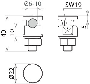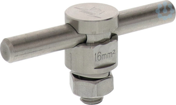 KlemmSchrauben-Verbinder nach DIN EN 62561-1, zum blitzstromtragfähigem Anschluss von Rundleitern z. B. an Flachprofile, Regenrohrschellen oder andere Teile der Blitzschutzanlage. Ausführung einteilig NIRO (V4A) mit Schraube, Mutter M10 und Führung mit Schlüsselfläche.