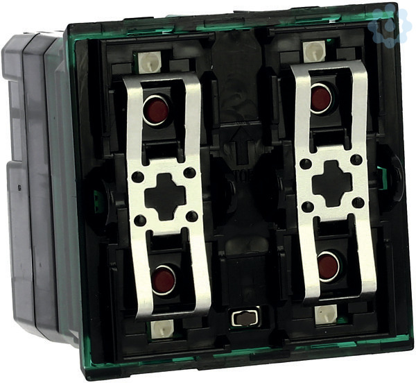 UP-Aktor mit 2 Schließern und frontseitiger lokaler Betätigung Zur Verwendung als Rollladenaktor (verriegelt) oder zum Schalten von 2 unabhängigen Lasten. Kontaktbelastbarkeit 6 A ohmsch, 2 A induktiv, 1 A LEDs und 460 W Motorantrieb, zu komplettieren mit 1- oder 2-moduligen Wippen.