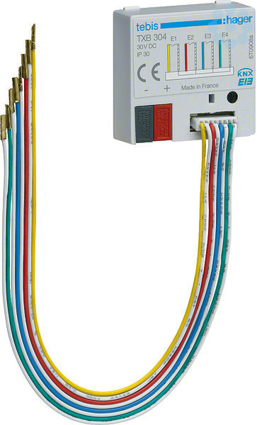 Binäreingang 4fach, UP, KNX. 4 Binäreingange UP (Tasterschnittstelle) zum Anschluss von handelsüblichen Tastern, Schaltern oder potenzialfreien Kontakten. Die Abfragespannung stellt der Binäreingang zur Verfügung. Das Gerät setzt die Schaltinformationen in Befehle auf den KNX Bus um. Der Binäreingang wird Unterputz in eine Gerätedose 60 mm eingesetzt. Funktionen der Applikationssoftware: Schalten EIN/AUS (senden auch mit zeitl. Verzögerung und periodischem Senden), Dimmen (1- und 2 Tasten dimmen), AUF/AB (1- und 2 Tasten Bedienung, auch Fahren solange gedrückt), Wertgeber für Temperatur, Helligkeit, Dimmwert in %, Alarmeingang mit periodischem Senden und Flankenwahl, Zweikanal-Modus pro Eingang für Schalt- und Wertaufruf-Funktionen. Funktion 1 über kurzen Tastendruck, Funktion 2 über langen Tastendruck. Sollwertauswahl für Heizungsfunktion, Blockierfunktion, Zwangssteuerung, Zeitschalteraufruf, Szenenabruf mit Taster (1 Szene) oder Schalter (2 Szenen). Verhalten bei Initialisierung und Busspannungswiederkehr definierbar.