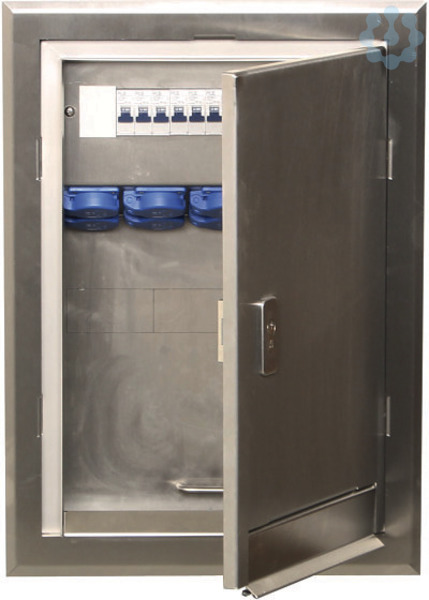Edelstahl-Unterputzverteiler mit abschließbarer Tür; Maße: 420x212x580mm (BxTxH); Farbe: Sichtseiten geschliffen (K240); Ausführung: IP44 (bei geschlossener Tür); Werkstoff: V2A-Edelstahl, rostfrei (1.4301); Bestückung:; 2 x Schutzkontakt-Steckdose 16A, 2P+E, 230V; 1 x CEE 16A, 5P, 400V; 1 x CEE 32A, 5P, 400V; Absicherung:; 2 x LS 16A, C, 1P; 1 x LS 16A, C, 3P; 1 x LS 32A, C, 3P; 1 x FI 63/0,03A, 4P, XA; ; ; Maueröffnung: B x H x T in mm = 400 x 550 x 212