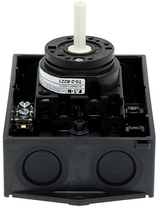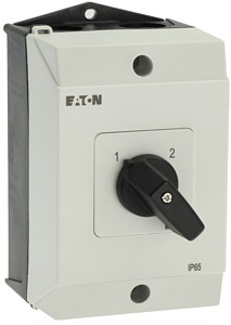 Umschalter, Sortiment: Steuerschalter, Typkenner: T0, mit schwarzem Knebel und Frontschild, Kontakte: 4, Schutzart: IP65, Bauform: Aufbau, Schaltwinkel: 90 °, Schaltverhalten: rastend, ohne 0-Stellung, Frontschild: 1-2, Bemessungsbetriebsleistung AC-23A, 50 - 60 Hz 400 V: P = 5.5 kW, Bemessungsdauerstrom: Iu = 20 A, 2 Baueinheit(en), Normen und Bestimmungen: IEC/EN 60947, VDE 0660, IEC/EN 60204, Lasttrennschalter nach IEC/EN 60947-3