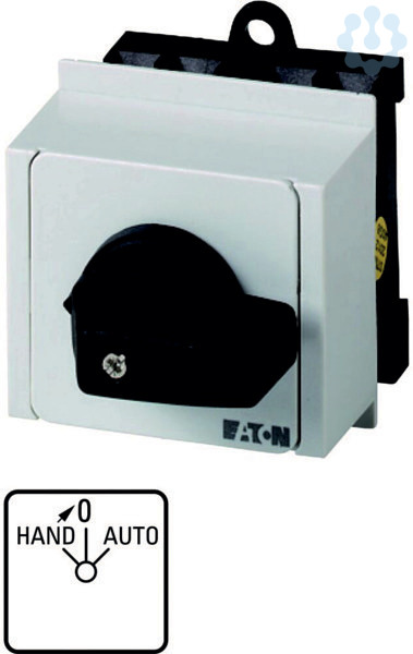 Umschalter, Sortiment: Steuerschalter, Normen und Bestimmungen: IEC/EN 60947, VDE 0660, IEC/EN 60204, CSA, UL, Lasttrennschalter nach IEC/EN 60947-3, Typkenner: T0, mit schwarzem Knebel und Frontschild, Kontakte: 2, Tastfunktion: mit Tast-Funktion HAND, Schutzart: Front IP30, Bauform: Verteilereinbau, Schaltwinkel: 45 °, Schaltverhalten: tastend/rastend, mit 0-Stellung, mit Rückzug nach 0, 1 Baueinheit(en), Bemessungsdauerstrom: Iu= 20 A, Frontschild: HAND>0-AUTO