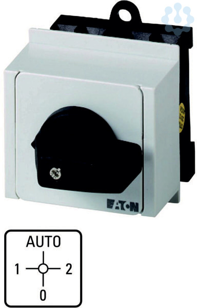 Umschalter, Sortiment: Steuerschalter, Normen und Bestimmungen: IEC/EN 60947, VDE 0660, IEC/EN 60204, CSA, UL, Lasttrennschalter nach IEC/EN 60947-3, Typkenner: T0, mit schwarzem Knebel und Frontschild, Kontakte: 4, Schutzart: Front IP30, Bauform: Verteilereinbau, Schaltwinkel: 90 °, Schaltverhalten: rastend, mit 0-Stellung, 2 Baueinheit(en), Bemessungsdauerstrom: Iu= 20 A, Frontschild: 1-AUTO-2-0