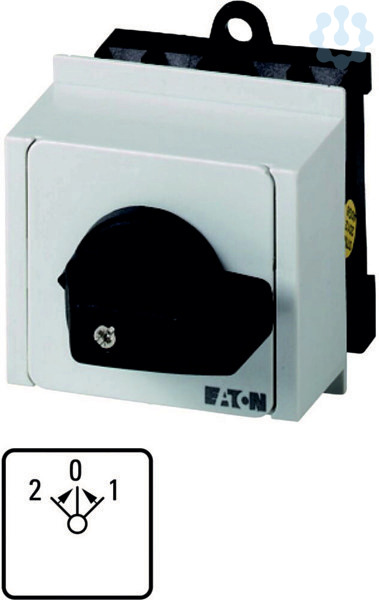 Umschalter, Sortiment: Steuerschalter, Normen und Bestimmungen: IEC/EN 60947, VDE 0660, IEC/EN 60204, CSA, UL, Lasttrennschalter nach IEC/EN 60947-3, Typkenner: T0, mit schwarzem Knebel und Frontschild, Kontakte: 8, Schutzart: Front IP30, Bauform: Verteilereinbau, Schaltwinkel: 45 °, Schaltverhalten: tastend, mit 0-Stellung, mit 2-seitigem Rückzug nach 0, 4 Baueinheit(en), Bemessungsdauerstrom: Iu= 20 A, Frontschild: 2>0<1