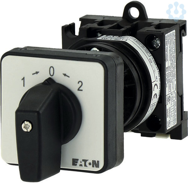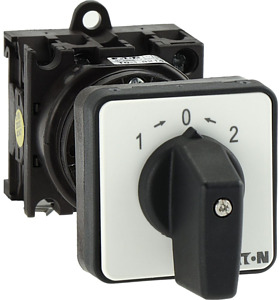 Umschalter, Sortiment: Steuerschalter, Typkenner: T0, mit schwarzem Knebel und Frontschild, Kontakte: 2, Schutzart: Front IP65, Bauform: Zwischenbau, Schaltwinkel: 45 °, Schaltverhalten: tastend, mit 0-Stellung, mit 2-seitigem Rückzug nach 0, Frontschild: 2>0<1, Bemessungsbetriebsleistung AC-23A, 50 - 60 Hz 400 V: P = 5.5 kW, Bemessungsdauerstrom: Iu = 20 A, 1 Baueinheit(en), Normen und Bestimmungen: IEC/EN 60947, VDE 0660, IEC/EN 60204, CSA, UL, Lasttrennschalter nach IEC/EN 60947-3