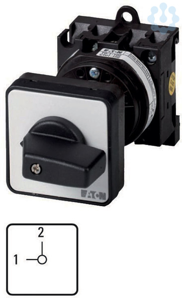 Umschalter, Sortiment: Steuerschalter, Normen und Bestimmungen: IEC/EN 60947, VDE 0660, IEC/EN 60204, CSA, UL, Lasttrennschalter nach IEC/EN 60947-3, Typkenner: T0, mit schwarzem Knebel und Frontschild, Kontakte: 2, Schutzart: Front IP65, Bauform: Zwischenbau, Schaltwinkel: 90 °, Schaltverhalten: rastend, ohne 0-Stellung, 1 Baueinheit(en), Bemessungsdauerstrom: Iu= 20 A, Frontschild: 1-2