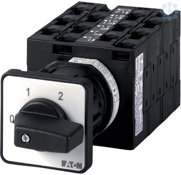 Umschalter, Sortiment: Steuerschalter, Typkenner: T3, mit schwarzem Knebel und Frontschild, Kontakte: 12, Schutzart: Front IP65, Bauform: Zentraleinbau, Schaltwinkel: 90 °, Schaltverhalten: rastend, ohne 0-Stellung, Frontschild: 1-2, Bemessungsbetriebsleistung AC-23A, 50 - 60 Hz 400 V: P = 15 kW, Bemessungsdauerstrom: Iu = 32 A, 6 Baueinheit(en), Normen und Bestimmungen: IEC/EN 60947, VDE 0660, IEC/EN 60204, CSA, UL, Lasttrennschalter nach IEC/EN 60947-3