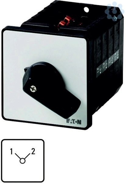 Umschalter, Sortiment: Steuerschalter, Typkenner: T5B, mit schwarzem Knebel und Frontschild, Kontakte: 8, Schutzart: Front IP65, Bauform: Einbau, Schaltwinkel: 90 °, Schaltverhalten: rastend, ohne 0-Stellung, Frontschild: 1-2, Bemessungsbetriebsleistung AC-23A, 50 - 60 Hz 400 V: P = 30 kW, Bemessungsdauerstrom: Iu = 63 A, 4 Baueinheit(en), Normen und Bestimmungen: IEC/EN 60947, VDE 0660, IEC/EN 60204, CSA, UL, Lasttrennschalter nach IEC/EN 60947-3