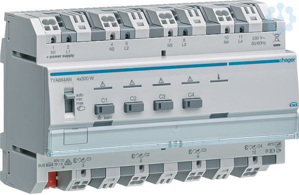 Universal-Dimmaktor 4-fach KNX, 4x300W, ESL/LED, kombinierbar. Universal-Dimmaktor zum Schalten/Dimmen und zur automatischen Erkennung der Lastart (Autodetect-Verfahren) und zur Optimierung des Dimmbereichs (Easydetect-Verfahren) mittels Tastendruckmodus am externen Sensor, am Gerät oder über ein Objekt. Profimodus zur Auswahl der Modis am Gerät oder per Buszugang. Zum Dimmen von dimmbaren LED und Energiesparlampen, Glühlampen, Hochvolt Halogenlampen und Niedervolt Halogenlampen mit konventionellem oder elektronischem Transformator. Das Gerät setzt die Businformationen in entsprechende Befehle um. Funktionen: Dimmen, Schalten, Zwang, Zeit, Ausschaltvorwarnung, Szenenabruf (64 pro Kanal, jeweils mit eigener Anfahrzeit). Jeder Dimmausgang hat am Gerät eine Handbedienung, die auch sperrbar ist, und eine Schaltzustandsanzeige per LED. Die Dimmkanäle können in verschiedenen Kombinationen zur Leistungserhöhung zusammengeschaltet werden. Mit Schutz gegen Überhitzung, Überlast und Kurzschluss. Beschriftungsmöglichkeit direkt am Gerät. Zusätzlich erkennt das Gerät über ein Statusobjekt den Stromfluss des Leuchtmittels.