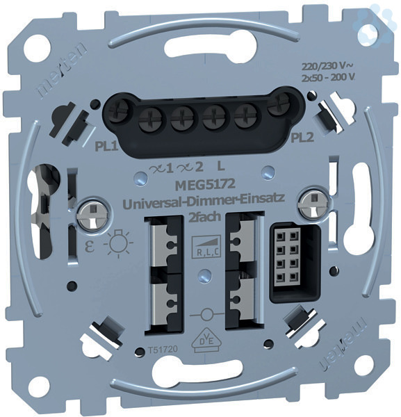 Für ohmsche, induktive oder kapazitive Lasten, z. B. Glühlampen, dimmbare gewickelte Trafos oder elektronische Trafos. (Phasenanschnitt oder Phasenabschnitt). Der Universaldimmer erkennt automatisch die angeschlossene Last. Keine Mischlasten anschließen. Mit Krallen- und Schraubbefestigung. Mit Schraubklemmen. Funktionen: -Schalten und Dimmen von zwei Ausgängen. Es wird durch das Modul die Art und Weise festgelegt, wie die Funktion des Einsatzes genutzt wird. Externe Ansteuerung über zwei PlusLink Eingänge. Überlast- und kurzschlussfest. Softstart. Memory-Funktion. Nennspannung: AC 220/230 V, 50/60 Hz. Ausgänge: 2. Schaltleistung pro Kanal: 50-200 VA. Neutralleiter: nicht erforderlich (2 Leitersystem). Anschlussquerschnitt: max. 2x2,5 mm². Zu komplettieren mit: Taster-Modul Basic, 1fach System M MEG5110-0300, System Design MEG5110-60xx Taster-Modul Basic, 2fach System M MEG5120-0300, System Design MEG5120-60xx Taster-Modul Comfort, 1fach System M MEG5111-0300. System Design MEG5111-60xx Taster-Modul Comfort, 2fach System M MEG5121-0300, System Design MEG5121-60xx Taster-Modul Comfort Plus mit IR, 1fach System M MEG5112-0300. Taster-Modul Comfort Plus, 2fach System M MEG5122-0300. Wiser Taster-Modul, 1fach System M MEG5113-0300, System Design MEG5113-60xx Wiser Taster-Modul, 2fach System M MEG5123-03xx, System Design MEG5123-60xx Drehregler-Modul System M MEG5252-03xx/-04xx. ARGUS 180 UP Sensor-Modul System M MEG5710-03xx/-04xx, System Design MEG5710-60xx ARGUS 180 UP Sensor-Modul mit Schalter System M MEG5711-03xx/-04xx, System Design MEG5711-60xx. ARGUS Präsenz 180/2,20 m UP Sensor-Modul System M MEG5530-03xx/-04xx ARGUS Präsenz Sensor-Modul mit IR MEG5522-00xx Zeitschaltuhr-Modul Standard System M MEG5754-03xx/-04xx. Zeitschaltuhr-Modul System M MEG5755-03xx/-04xx, System Design MEG5755-60xx. Sender: Nebenstelle Plus, 1fach System M MEG5119-0300, System Design MEG5119-60xx Nebenstelle Plus, 2fach System M MEG5129-0300, System Design MEG5129-60xx Zentralstellen-Einsatz MEG5190-0000. Zubehör: PlusLink Verteiler (3 Phasen) MEG5130-0001. PlusLink-Erweiterung MEG5130-0000.
