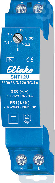 Universal-Schaltnetzteil. Mit 5 einstellbaren Ausgangsspannungen 3,3V/5,0V/7,5V/9,0V/12V DC-1A. Stand-by-Verlust nur 0,2 Watt. Reiheneinbaugeräte für Montage auf Tragschiene DIN-EN 60715 TH35. 1 Teilungseinheit = 18mm breit, 58mm tief. Bei einer Belastung größer als 50% der Nennleistung und immer bei nebeneinander liegenden Schaltnetzteilen ist beidseitig 1/2 Teilungseinheit Lüftungsabstand mit den Distanzstücken DS12 erforderlich. Eingangsspannung 230V (-20% bis +10%). Stabilisierte Ausgangsspannung ±1%, geringe Restwelligkeit. Kurzschlussfest. Überlast- und Übertemperatursicherung durch Abschalten mit automatischem Zuschalten nach der Fehlerbeseitigung (Autorecovery-Funktion).