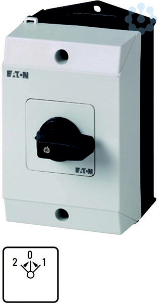 Universal-Steuerschalter, Sortiment: Steuerschalter, Normen und Bestimmungen: IEC/EN 60947, VDE 0660, IEC/EN 60204, Lasttrennschalter nach IEC/EN 60947-3, Typkenner: T0, mit schwarzem Knebel und Frontschild, Kontakte: 6, Tastfunktion: Tastfunktion in Stellung 1 und 2, Schutzart: IP65, Bauform: Aufbau, Schaltwinkel: 45 °, Schaltverhalten: tastend, mit 0-Stellung, mit 2-seitigem Rückzug nach 0, 3 Baueinheit(en), Bemessungsdauerstrom: Iu= 20 A, Frontschild: 2>0<1
