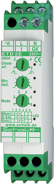 Mit dem elektronischen Universal Tastdimmern ETD 2E (Reiheneinbau-Variante) lassen sich verschiedenste Leuchtmittel (LED-, Energiespar-, Glühlampen, NV-Halogenlampen mit Tronic- oder gewickelten Trafos, HV-Halogenlampen) dimmen. Neben einer automatischen Erkennung für gewickelte Trafos (Dimmart 'Auto') lässt sich bei Bedarf die Dimmart auch manuell auf Phasenan- oder Phasenabschnitt einstellen (evtl. notwendig bei Leuchtmitteln mit elektronischen Vorschaltgeräten). Eine spezielle ESL-Dimmart erzeugt zusätzlich eine Zünd- und Aufwärmphase für Kompaktleuchtstofflampen ('Energiesparlampen'). Durch die kompakten Gehäusemaße lässt sich der ETD U2 direkt in die Installationsdosen hinter einen Taster eines beliebigen Schalterprogramms einbauen, und eignet sich somit gleichermaßen für Neuinstallationen sowie als wartungsfreier Ersatz für vorhandene (defekte) Dreh- oder Tastdimmer. Durch integrierte Grundlast für Betrieb an Netzfeld-Abschalter geeignet. Auch als funktionsgleiche UP-Variante ETD U2 erhältlich., Maße: 18x55mm, 230V AC, 0-500W
