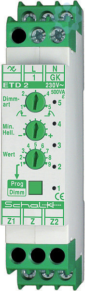 Mit dem elektronischen Universal-Tastdimmer ETD 2 lassen sich verschiedenste Leuchtmittel (LED-, Energiespar-, Glühlampen, NV-Halogenlampen mit Tronic- oder gewickelten Trafos, HV-Halogenlampen) dimmen. Neben einer automatischen Erkennung für gewickelte Trafos (Dimmart 'Auto') lässt sich bei Bedarf die Dimmart auch manuell auf Phasenan- oder Phasenabschnitt einstellen (evtl. notwendig bei Leuchtmitteln mit elektronischen Vorschaltgeräten). Eine spezielle ESL-Dimmart erzeugt zusätzlich eine Zünd- und Aufwärmphase für Kompaktleuchtstofflampen ('Energiesparlampen'). Der ETD 2 besitzt zwei zusätzliche potentialgetrennte Eingänge, die sich auch zur Gruppensteuerung eignen. Außerdem ist er auch direkt über eine Fronttaste bedienbar. Alle 3 Eingänge und die Fronttaste sind individuell programmierbar. Somit kann der Dimmer wahlweise mit nur 1 Taste geschaltet und gedimmt werden, oder aber mit 2 separaten Tasten. Des weiteren stehen auch reine Schaltfunktionen zur Verfügung. Außerdem können Memory, Schlummerfunktion, Laufzeit, Sanft-Ein-Rampe, Sanft-Aus-Rampe und Starthelligkeit vorgegeben werden., Maße: 18x55mm, 230V AC, 0-500W