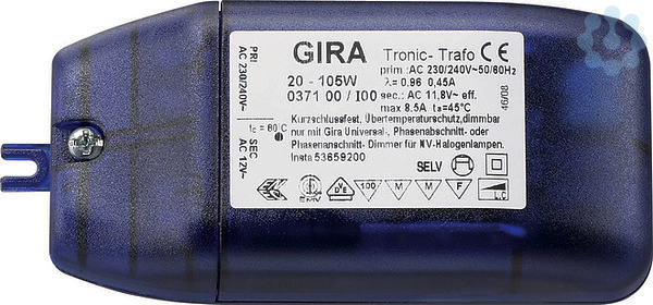 Tronic-Trafo universal, elektronischer Transformator für NV-Halogenlampen 12 V, kompakte Bauweise20 - 105 WMerkmale: Dimmbar mit Gira NV-Dimmer (Mindestlast = 50 W), Gira Tronic-Dimmer oder Gira Universaldimmer (ab R2). Abschaltung mit automatischem Wiederanlauf nach Kurzschlussbeseitigung. Überlast- und Übertemperaturschutz. Automatische Leistungsreduzierung bzw. Abschaltung bei weiterer Erwärmung. Automatischer Wiederanlauf nach Abkühlung. Kurzschlussfest. Mit Schraubklemmen.Hinweise : Sicherheitstransformator nach VDE 0712 24.