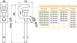 Universalklemme, Spindel mit Querstift, nach DIN VDE 0683-100 (EN/IEC 61230) zum Erden und Kurzschließen von Flach- und Rundleitern bis 30 mm und Kugelfestpunkten, Kugel D = 25 mm.