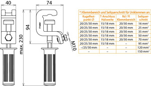 Universalklemme, mit Handgriff aus Kunststoff, nach DIN VDE 0683-100 (EN/IEC 61230) zum Erden und Kurzschließen von Flach- und Rundleitern bis 30 mm und Kugelfestpunkten, Kugel D = 25 mm.