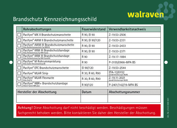 Walraven Pacifyre® Kennzeichnungsschild, beidseitig bedruckt und universell einsetzbar, kennzeichnet an Wänden und Decken auch die Walraven-Brandabschottungen der Pacifyre®- und Tangit FP-Produktreihen, Länge 146 Millimeter, Breite 105 Millimeter.