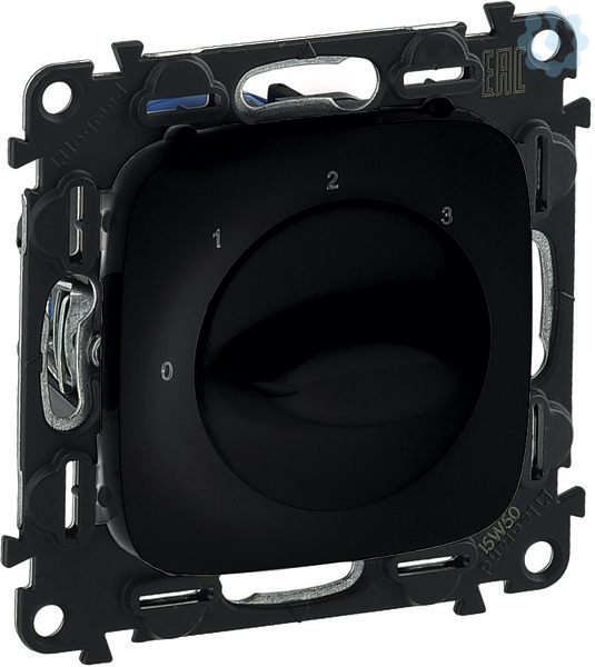 Valena Allure Drehschalter 3-Stufenschalter mit Nullstellung (0, 1, 2, 3) 1-polig mit N-Klemme, Schraubklemmen, geliefert inkl. Abdeckung. Schaltvermögen: Ohmsche Last (AC-21 A): 20 AMotoren (AC-23 A): 2,5 kW. Farbe: Schwarz