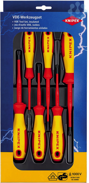 00 20 12 V05 VDE Schraubendreher-Paket Werkzeuge im Kunststoff-Tiefziehteil mit transparentem Deckel. Attraktive Verkaufsverpackung mit SB-Lochung. Abmessungen (B x H x T): 170 x 370 x 40 mm. SB-Karte/Blister. Lieferumfang: 1 x 98 20 25 KNIPEX Schraubendreher für Schlitzschrauben (2,5 mm), 1 x 98 20 40 SL KNIPEX Schraubendreher (Slim) für Schlitzschrauben (4,0 mm), 1 x 98 24 01 SLS KNIPEX Schraubendreher (Slim) PlusMinus Phillips® (PH/S 1), 1 x 98 24 02 SLS KNIPEX Schraubendreher (Slim) PlusMinus Phillips® (PH/S 2), 1 x 98 25 01 SLS KNIPEX Schraubendreher (Slim) PlusMinus Pozidriv® (PZ/S 1), 1 x 98 25 02 SLS KNIPEX Schraubendreher (Slim) PlusMinus Pozidriv® (PZ/S 2),