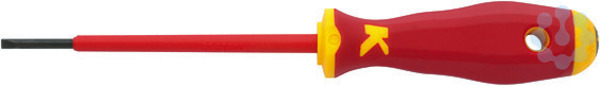 VDE-Schraubendreher für Schlitzschrauben, Querloch im Griff, ergonomischer 2-Komponenten-Griff für höchste Drehmomente und besten Arbeitskomfort, geeignet für Schlitzschrauben, Griffkopf mit Abrollschutz, schlagfester Hartkern, schwarze Spitze für präzise Passung.