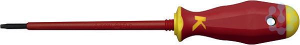 VDE-Schraubendreher-TORX, TX 10. Querloch im Griff, ergonomischer 2-Komponenten-Griff für höchste Drehmomente und besten Arbeitskomfort, geeignet für Torx-Schrauben, Griffkopf mit Abrollschutz, schlagfester Hartkern, schwarze Spitze für präzise Passung.