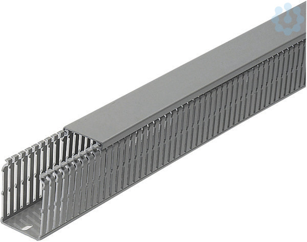 Verdrahtungskanal bestehend aus Unter- und Oberteil. Mit Sollbruchstellen am Stegansatz und Drahtrueckhaltenasen am Stegende. Die Bodenlochung entspricht der EN 50085.