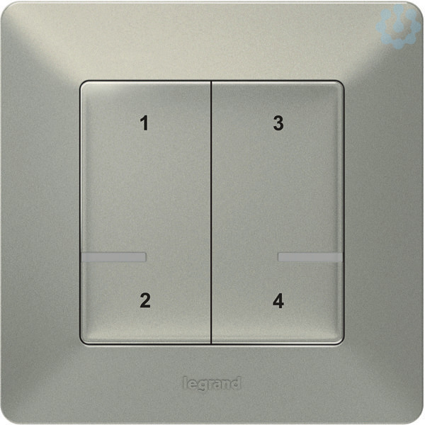 Funk-Szenentaster mit 4 Tasten für "Valena Life with Netatmo" - Wird genutzt um 4 frei definierbare Alltagsszenarien zu erstellen. Dabei werden Beleuchtung, Rollläden und Steckdosen einbezogen. Die Szenarien können über die App „Home + Control“ eingerichtet werden. Extra-flache Ausführung, wird mittels mitgelieferter Klebestreifen flexibel an der Wand befestigt und kann jederzeit versetzt werden. Mittels Schrauben auch auf eine Unterputzdose montierbar. CR 2032 - 3 V-Knopfzellen im Lieferumfang enthalten (Standby-Lebensdauer: 8 Jahre). Auslieferung inkl. Wippe und Abdeckrahmen.Ausführung: Valena Life in der Farbe Aluminium
