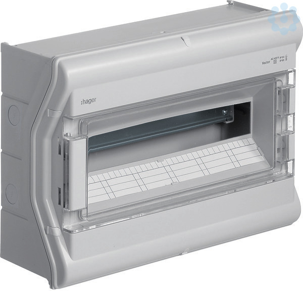 Kleinverteiler, vector, APV, IP65, 18PLE, UV-stabil, m. metr.Leitungseinführung. Installationskleinverteiler aus Polycarbonat (UV-beständig), nach DIN EN 60670-24, nach DIN 43871. Zum Einbau von Geräten bis 63 A nach Maßnorm DIN 43 880 mit 70 mm oder 85 mm Einbautiefe, Bemessungsspannung AC 400 V/50 Hz. Bestehend aus Kunststoffunterteil mit Hutprofilschiene aus verzinktem Stahlblech, Vorprägung für metrische Leitungseinführungstüllen (oben, unten), seitliche Vorprägungen für Verbindungstüllen zur Verbindung von zwei oder mehreren Verteilern nebeneinander. Oberteil mit 46 mm Geräteschlitz. Klarsichttür frontbündig, rechts oder links anschlagbar, plombierbar, abschließbar, Verteiler anflanschbar.