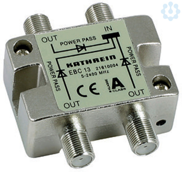 3fach-F-Verteiler 5-2400 MHz, Schirmklasse A, Anschluss fuer Potenzialausgleich, Fernsp. max. 24 V 0,5 A 3 Ausg., Entkopplungsdioden OUT-IN