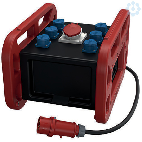 MENNEKES Verteiler EverBOX GRIP, tragbar anschlussfertig verdrahtet Schutzgrad IP 44 Gehaeuse: 1 PE-Gehaeuse 530 x 370 x 320 mm (L x B x H) schwarz RAL 9005, stapelbar, mit Tragegriffen rot Die umlaufenden Tragegriffe bieten maximalen Griffkomfort und dienen gleichzeitig als zusaetzlichen Schutz fuer Gehaeuse, Steckdosen und Sicherungselemente. Absicherung unter transparenter Betaetigungsklappe Bestueckung/Absicherung: Pos. 01 1x CEE-Anbaudosen 16A5p 6h 400V IP 44 Pos. 02 6x Schuko-Steckdosen 16A2p+E 230V IP 44 6x LS-Schalter 16A 1p C 10KA Pos. 01+02 1x Fi-Schutzschalter 40A 4p IFN=0,03A Zuleitung/Anschlussmoeglichkeit: 2m Zuleitung H07RN-F5G2,5 und CEE-Stecker 16A5p 6h 400V