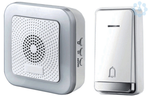 Sender für Außenmontage mit Ruftaste, IP44 und batterielos durch Piezoeffekt. Empfänger zum Einstecken in die Schutzkontaktsteckdose 230V DC, Flash-LED-Funktion, 32 Melodien, 4-stufig einstellbare Lautstärken bis 96 dB. Funktionswahl: a) nur Melodie, b) Melodie und Flash, c) nur Flash. Nachtlichtfunktion ein-/ausschaltbar. Programmierung selbstlernend. Reichweite im Freien bis zu 150 m. Funkfrequenz: 433 MHz, Abmessungen: 80x80x67 mm, Farbe: weiß