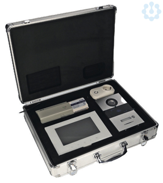 Musterkoffer VILLA MKW, bestückt mit 1x Monitor VILLA M, 1x Türstation VILLA 1AS, 1x Netzgerät VILLA NG, 1x WLAN-Gateway VILLA GW, 1x WLAN-Steckdose VILLA SW, 2x Chipkarte VILLA K, fertig verdrahtet und voll funktionsfähig (inkl. LED-Anzeige für Türöffnerkontakt), mit Schutzkontakt-Stecker-Verbindung