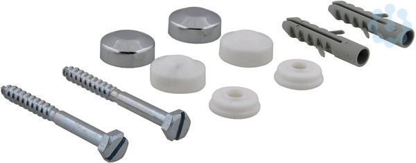 Walraven Befestigungssatz für WC zehnteilig mit zwei Sechskantholzschrauben aus verzinktem Stahl 6 mal 80 Millimeter DIN 571 mit Schlitz, vier POM-Abdeckkappen (zwei chromefarben, zwei weiß), zwei PP-Unterlegscheiben und zwei Dübeln aus Polyamid.
